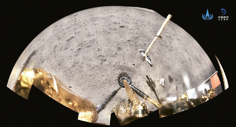 2020年12月4日,國家航天局公布了探月工程嫦娥五號(hào)探測(cè)器在月球表面國旗展示的照片。嫦娥五號(hào)著陸器和上升器組合體全景相機(jī)環(huán)拍成像,五星紅旗在月面成功展開,此外圖像上方可見已完成表取采樣的機(jī)械臂及采樣器。 新華社發(fā)(國家航天局供圖)